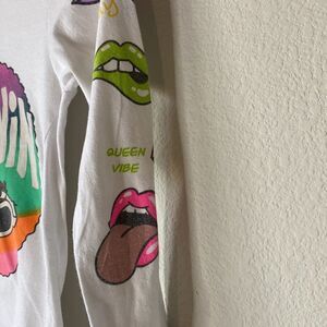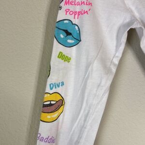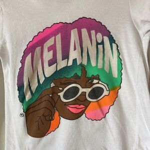 Girl’s Queen Melanin Diva Hoodie Size Small 7/8. Front logo has MELANIN in capital letters and sleeves say slay, Queen vibe, baddie, diva, dope, and melanin poppin’. This is such an amazing shirt! White with colorful rainbow graphics.
