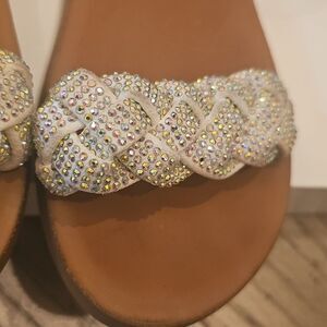 Step out in style with these sandals. Featuring a chic braided design adorned with sparkling rhinestones, these sandals are perfect for any occasion. The adjustable strap ensures a comfortable fit. Elevate your wardrobe with this stunning pair.