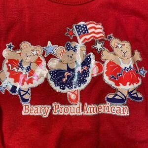 Red, White and Blue Flag and dancing bears with “Beary Proud American“ on chest