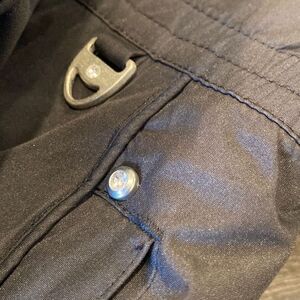 Adjustable shoulder straps. Pockets with zippers. Ankle zippers. Zip front. See pics. Pink mfr tag and gemstone on metal pieces.