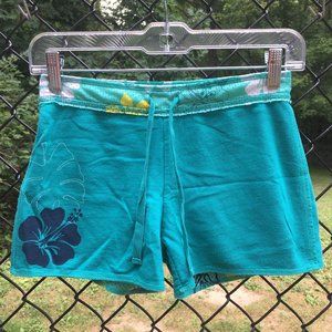 Teal/green/white/navy girl's hibiscus flower reversible shorts.