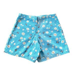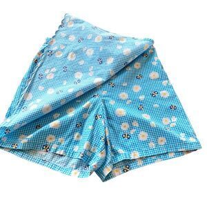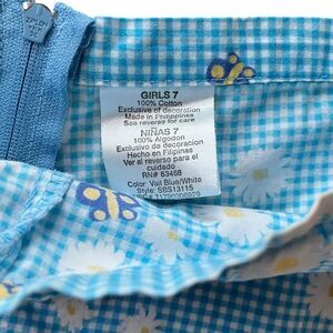 Blue and white gingham with a daisy and butterfly print, back zipper closure, lightweight cotton fabric. So cute on!