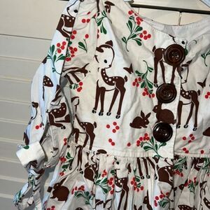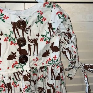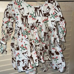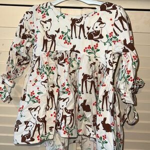 Girls size 5 deer blouse, Gorgeous Blouse, featuring three-quarter sleeves with a split in each sleeve detail and a tie at the end, Beautiful fabric features a little deer with berries and green leaves, full ruffle at the bottom a little longer in the back sit in the front, this was custom-made so the measurements are are 12 inches across the chest with a total overall length of 17 inches in the back and 16 in the front .