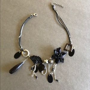 Beads, chains, fabrics...all come together to make this slightly Goth choker an eye-catcher. About 14” long with a 3” chain for adjustment. Excellent condition.
