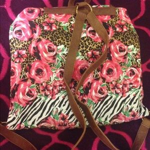 Printed backpack with girly designs (zebra, roses, color pink). Faux leather straps. Perfect for school book bag use or use as an everyday bag. 16 by 16 inches