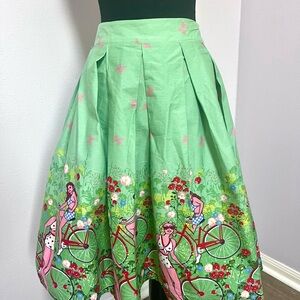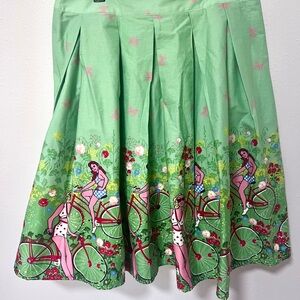 The new elegant green skirt showcases a knee-length A-line silhouette with delicate pleats, making it perfect for resort wear or casual outings. The "Girls Just Wanna Have Fun" skirt features a box-pleated design with a mint background adorned with a playful, summery scene of retro girls riding their bikes. The light and airy fabric ensures both comfort and style, making it an ideal choice for warm-weather adventures. This skirt is made of 95% cotton and 5% spandex.