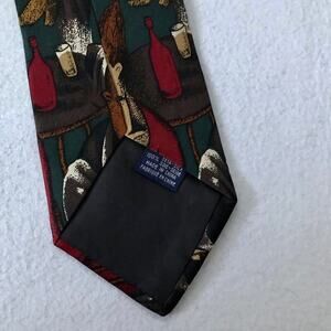 Excellent condition. Graphic handmade Tie, red, green, tan, brown. As per tag it is "100" silk". Pictures are part of description.