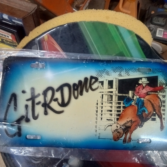 Decorative license plate featuring a rodeo scene with 'Git-R-Done' text. Perfect for cowboy enthusiasts. Vintage airbrushed souvenir that has wear from use.