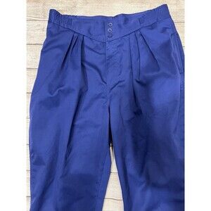 The Gitano 1980s Vintage Bright Blue High Waisted Pants in size 18 are a stylish and retro addition to any woman's wardrobe. Made from a blend of polyester and cotton, these ankle-length pants feature a solid blue color, tapered leg style, and pleated front design. With a zip and button closure, elastic waist, and pockets, these plus-size pants offer comfort and style for any occasion. The vintage brand Gitano adds a touch of nostalgia to these trendy high-waisted pants, making them a fashionable choice for those who appreciate a classic look. 34 inch waist, 14.5 inch rise and 28 inch inseam. Smoke free home.