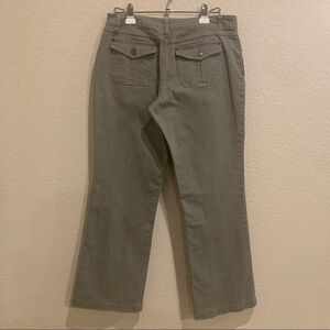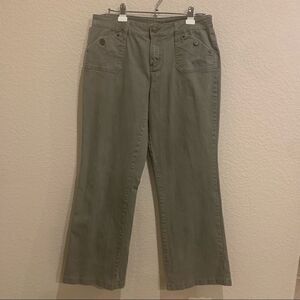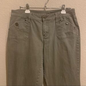 Drab olive green jeans by Gitano in size 10. Front and back pockets with button detail. Bit of stretch. Straight, somewhat wide legs. In good used condition, see pics for light wear. Photos are a part of the description. Color may vary with lighting or device.