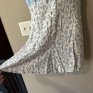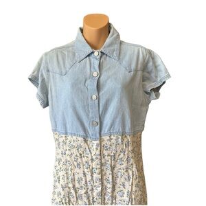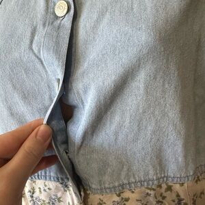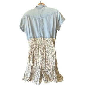 Chic romper with a denim top and floral bottom. Ideal for casual wear.
