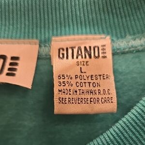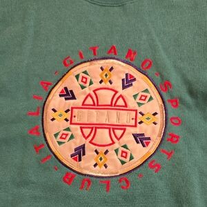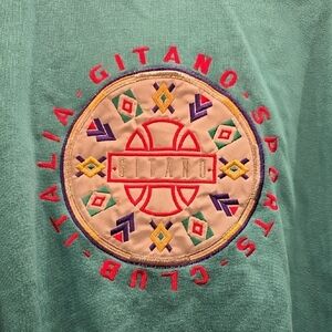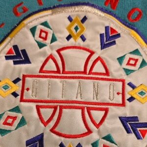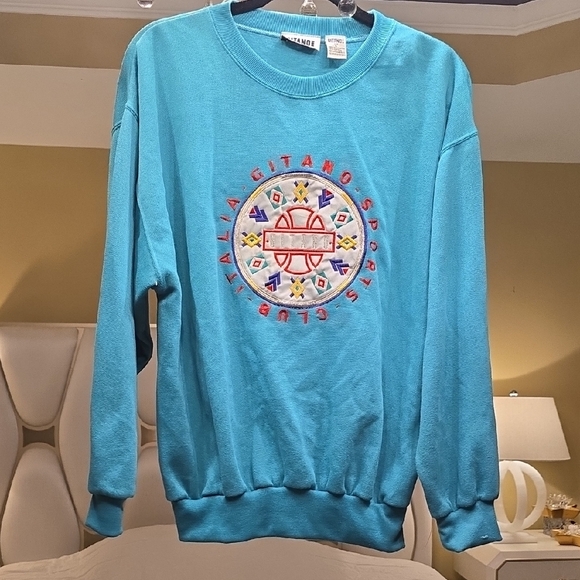 Can fit an XL. Stylish blue sweatshirt with colorful embroidery. Comfortable and trendy.
