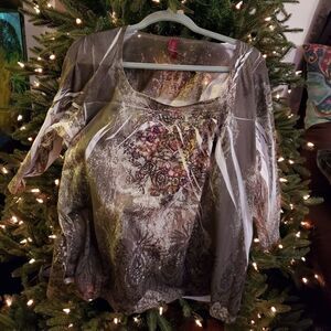 Army Green, tan, white and maroon tunic. Sleeves hit around elbow. Neck line is like a square. Cute design on front that says morocco and dazzled with some silver beads. Very comfortable light weight shirt.