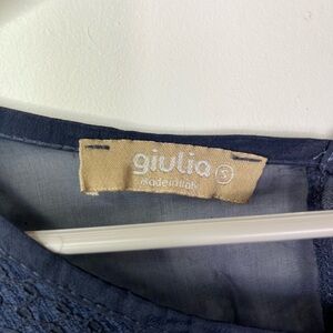 Lightweight, romantic navy dress by Giulia (Made in Italy) in size Small. Features beautiful crochet lace across the top and sleeves, sheer silk-like fabric throughout, and keyhole back. This dreamy piece is unlined — perfect for layering over a slip or as a floaty festival look.