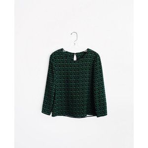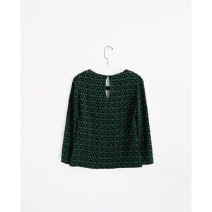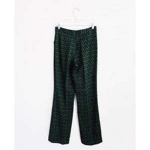 Giulietta New York Green Black Print Top and Pants Set size IT 40 US 4, gently used--a few snagged runs throughout--e.g. pics 7 and 8, fall 2015, has been professionally altered--top was brought in at the bodice for a slimmer fit, pants have been hemmed--2" of extra fabric tucked into hem, top: scoop neck with buttoned back vent, slightly cropped long sleeves, A-line silhouette, straight hem, pants: high waist, hidden side zip, slant seam hip pockets, bootcut or flare leg, continued in comments
