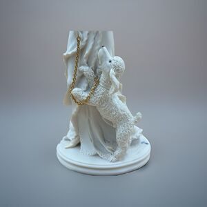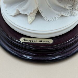 Elegant Giuseppe Armani porcelain figurine, handcrafted in Florence, Italy in 1994. This detailed sculpture depicts a refined lady in flowing Edwardian dress, gracefully holding a poodle on a gilt chain leash. Finished in Armanis signature bisque porcelain with soft hand-painted accents, mounted on its original polished wood base. Signed Giuseppe Armani and marked with the Florence N Capodimonte style hallmark.