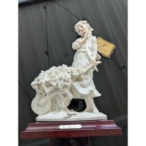 This exquisite figurine by Giuseppe Armani is a stunning piece of art that will add a touch of romance and elegance to any room. Made of high-quality porcelain, the figurine features a Capodimonte girl holding a wheelbarrow, with a beautiful flower pattern in ivory and subtle cheek and lip color. The 3D effect and intricate details make this figurine a true collector's item.