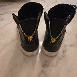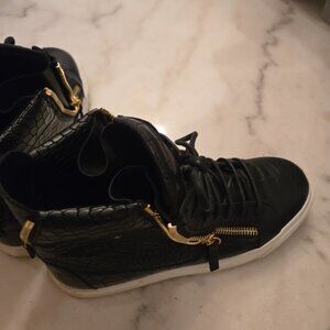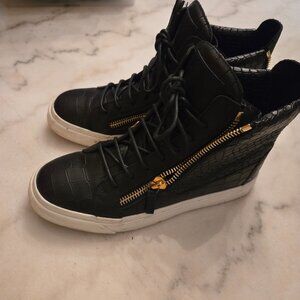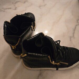 Keywords: Giuseppe Zanotti, High Top Sneakers, Black Sneakers, Croc Embossed, Crocodile Print, Leather Sneakers, Designer Sneakers, Luxury Footwear, Italian Fashion, Gold Zippers.