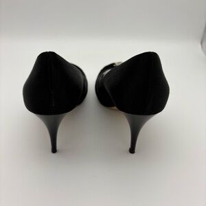 Giuseppe Zanotti Black Satin and Crystal Rhinestone Peep Toe Kitten Heel Pump; Size 37 (US 6.5); Heel rise 3"; Gently used; Last 4 pictures show slight rubs in the fabric, however, the last 3 are difficult to detect unless looking for it