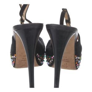 These stunning black heels by Giuseppe Zanotti feature a sleek stiletto design and a platform sole embellished with vibrant rhinestones. The adjustable slingback strap and peep-toe design add a touch of sophistication, making them perfect for any glamorous occasion.
