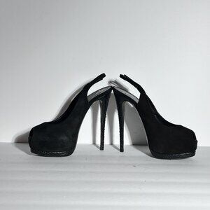 Yowee! These are a skyscraper tall 6 inch heel, on a 1.5 inch platform. Not for the faint of heart. Black suede peep toe wrapped platform, with snakeskin trim on edge of shoe, as well as the heels. Leather sole. Slingback buckles at heel, and fits 8 or 8.5 well. In excellent condition, and comes with original box. This is the pinnacle of super sexy, party shoe. Not.made for long.walks, extreme dance moves, or. people who. drink. too much.
