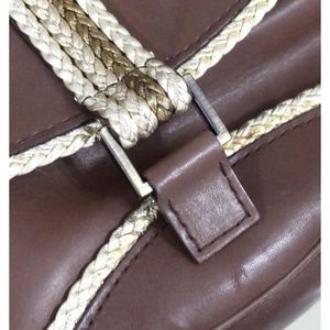Body of bag is a warm brown soft leather with shades of gold braided leather piping detail.