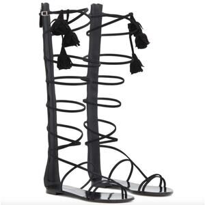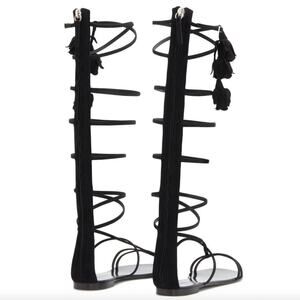 A statement in craftsmanship and luxury, the Danse Du Feu Gladiator Sandals from Giuseppe Zanotti combine bohemian edge with high-fashion detailing. Designed in rich black suede, these knee-high sandals feature an intricate strappy design with tassel embellishments, secured by a rear zip and side buckle fastening. The flat sole ensures comfort while maintaining the brand’s signature glamour.