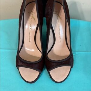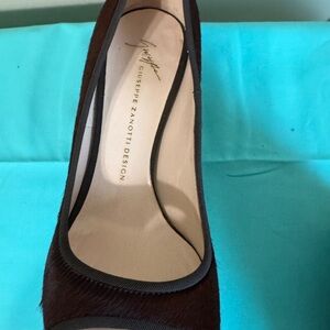 Chic dark brown peep-toe heels by Giuseppe Zanotti. Sleek design for versatile elegance. Size: 35 1/2 / 5 1/2; Condition: Very Good/Like New