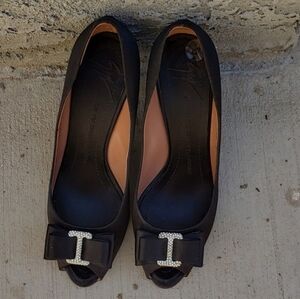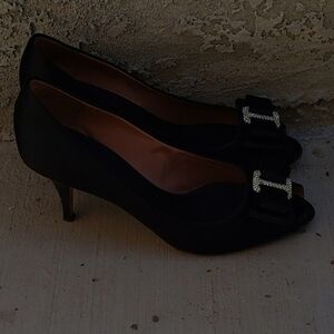 🤩Wore them once for a wedding🤩 black satin heels. They feature an open toe design, bow accents on the toes, rhinestones buckle detailing and tortoise heels. Almond toes. Height: .3 inches