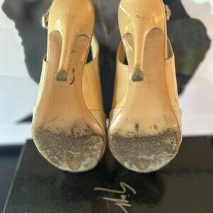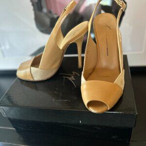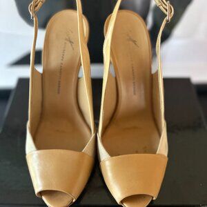 Kalifa peep-toe heel from Giuseppe Zanotti. Slingback nude heel with 4.5" heel. Italian heels - leather and textile with leather sole. Comes with original box. There are some scuffs - please see the pictures for all details. EU Size 38 heels, US women's size 8