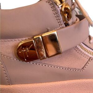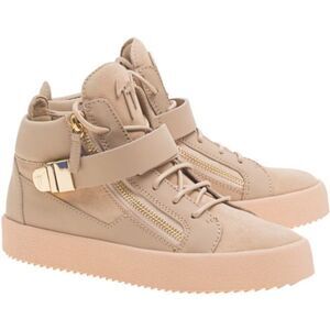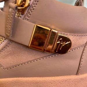 Elevate your style with these authentic Giuseppe Zanotti high-top sneakers. Crafted in Italy, these sneakers feature a unique beige color, gold-tone hardware, and a signature design that makes a bold fashion statement. Perfect for casual or semi-formal wear, these sneakers offer comfort without compromising on style.