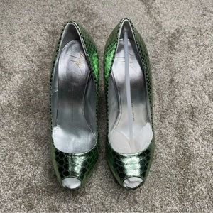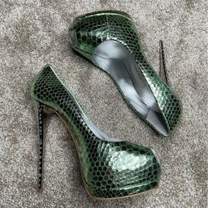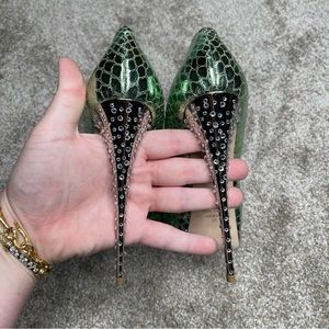 Stunning metallic green platforms. Snakeskin texture. Elegant stiletto heel with rhinestone detail.