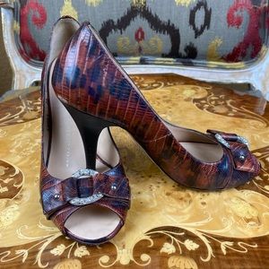 Pretty Jewelry for your feet. These adorable Peep Toe Heels with a Crystal ring Buckle ( one crystal missing shown in photo) Burgundy and Brown Croc printed Leather with 3 1/2” Wood stacked heel small Knick in heel shown in photos