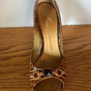 Elegant stilettos by Giuseppe Zanotti feature a raffia pattern in burnished gold with gemstones around the toe. Size 39. Comes with original box and bag if buyer desires.