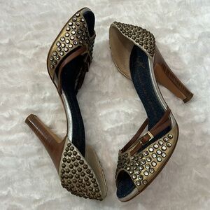 Bronze leather and brown rhinestone and stud encrusted high heel peep toe shoes!