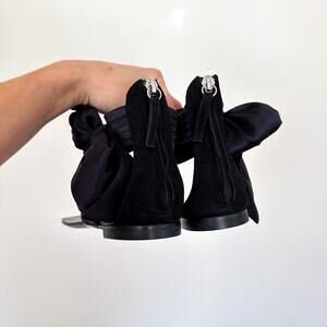 Details: Giuseppe Zanotti Satin Toe Ring Bow Detail Flat Sandals - Size: 38.5- Color: Black- Material: Leather/Synthetic- Features: Toe-ring, bow detail, flats, open-toe, lightweight, back zip closure, comfort, breathable, casual.