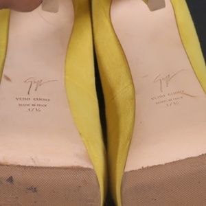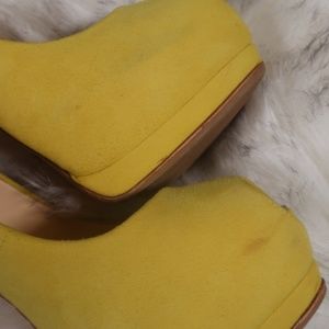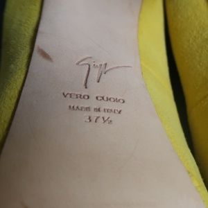 This previously loved shoe is from my personal collection. The color is a yellow/green/lime color which is totally HOT right now. You just don't see these often. These babies need a new loving home. This is very unique color and will surely turn heads when you strut into a room. The heel is 105 and is manageable to walk and dance in for seasoned heel wearers. There is a small nick on one the heels and a superficial stain on the toe box (see pictures). This can easily be fixed/cleaned. SIZE 7.5