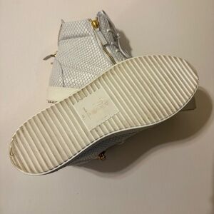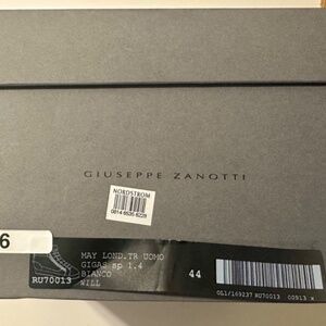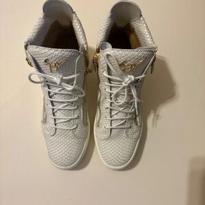 Giuseppe Zanotti high top sneakers in size 44 (US 11). These sneakers feature a white color with animal print detailing, perfect for adding a touch of personality to any casual outfit. Made with leather for durability and a comfortable fit, these sneakers are designed for men and come in a trendy sneaker style. Ideal for those looking for a fashion-forward footwear option with a touch of luxury.