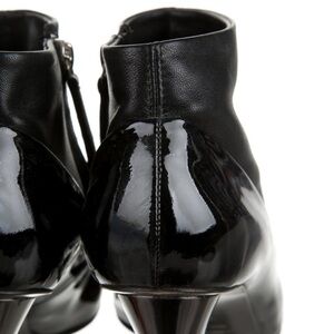 Black leather Giuseppe Zanotti square-toe booties with tonal stitching, patent leather at feet, lacquered conical heels and zip closure at counters. Very Good Condition. Some scuffing at soles. Comes with box.