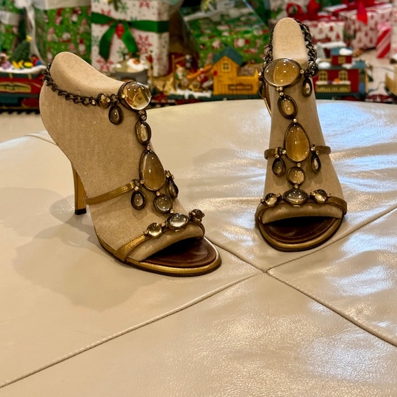 Style tags: Jeweled heels, gold sandals, dressy evening shoes, designer mules.