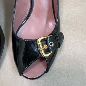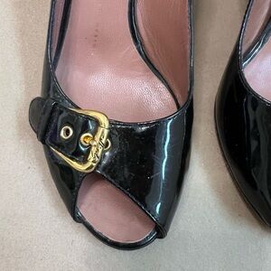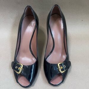 Giuseppe Zanotti Women’s Black Patent With Gold Buckle Peep Toe Heels 37