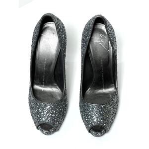 For Sale, Giuseppe Zanotti Design Italian Made Metallic Glitter Embellished Peep Toe Pumps With Silver Accents.