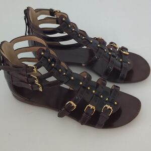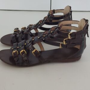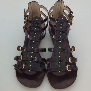 Black patent leather gladiator sandals with studs, buckles and red trim