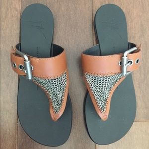 Flat leather sandals with buckle and chain mesh detail. Worn once or twice