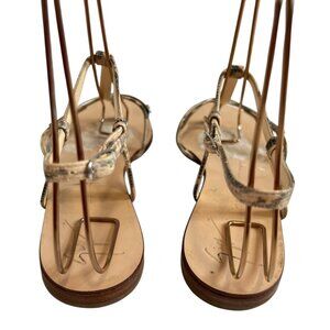 Giuseppe Zanotti sandals, Two Tone Lizard Embossed Leather, beige and gray, silver tone metal embellishment, flat, wrap around ankle strap, leather soles, EU 38 / US 8, preowned and has sticker pad residue, shows wear on the soles - see photos