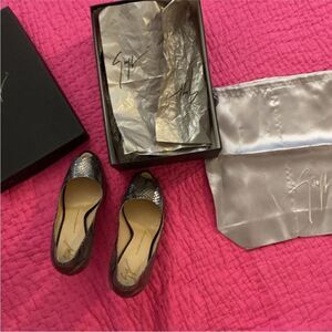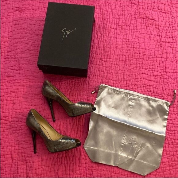 These elegant black heels by Giuseppe Zanotti showcase a classic pointed toe and a sleek stiletto heel, perfect for adding a touch of sophistication to any outfit. Crafted with precision, they come with a branded box and a protective dust bag, ensuring they remain in pristine condition. Ideal for both formal occasions and stylish evenings out, these heels embody luxury and timeless style. Excellent condition, comes with box and dust bags