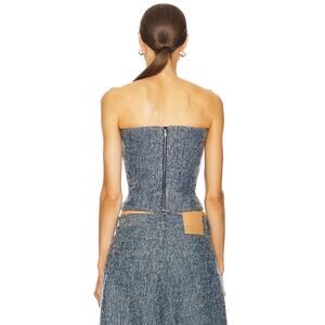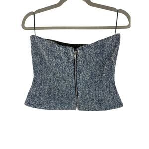 The Giuseppe di Morabito Structured Strapless Cropped Top in blue features a sculpted silhouette crafted from a premium wool blend. This chic, modern design accentuates the waist with its tailored fit and elegant minimalist appeal.