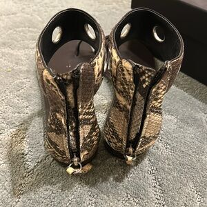 Giuseppe zanotti flat sandals with zip back ankle cuff with grommets and toe ring. Multi neutral python embossed leather. Firm leather footbed size 7