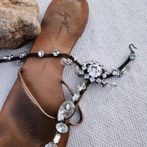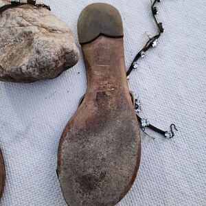 oversized gemstone detailed sandals. perfect for a beach wedding. has darkening on the footbed. Preloved condition. All sections of interest as well any known flaws have been documented in the photos and noted as thoroughly as possible. if there are no known flaws, none will be noted. Please feel free to ask any questions before purchase 🙂.