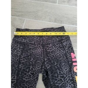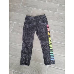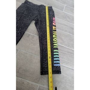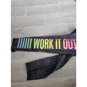 Betsey Johnson workout leggings. Black/gray leopard print. Colorful writing down the side that says work it out. GUC. Size Small, approximate measurements in photos.